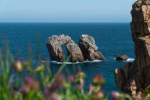 Urros de Liencres en la costa del mar de Cantabria con flores en primer plano