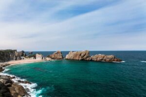 The picture represents a landscape of the Cantabrian coast, beach Arnia in Liencres. The sea, blue cloudy sky and an open rockface.