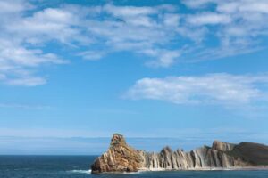 The picture represents a landscape of the Cantabrian coast, beach Portio in Liencres. The sea, blue sky and an rocks.