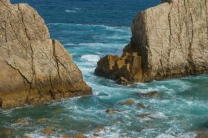 Touristic, Rocks on the beach. Dramatic view of Playa de la Arnia, rocky coastline in Santander ,Cantabria, Spain.